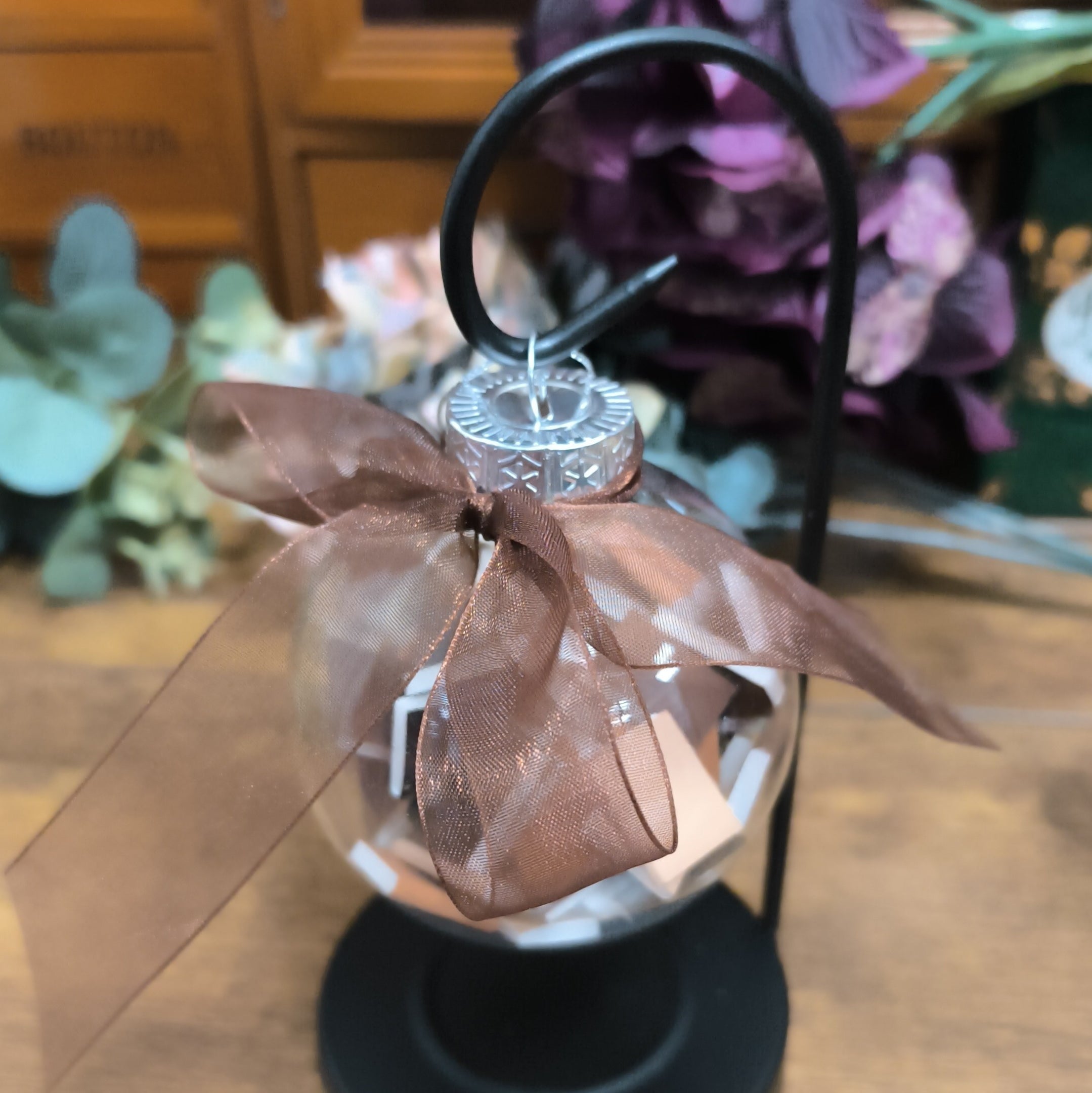 Clear bauble filled with tiny books in shades of brown and beige and finished with a brown organza ribbon.